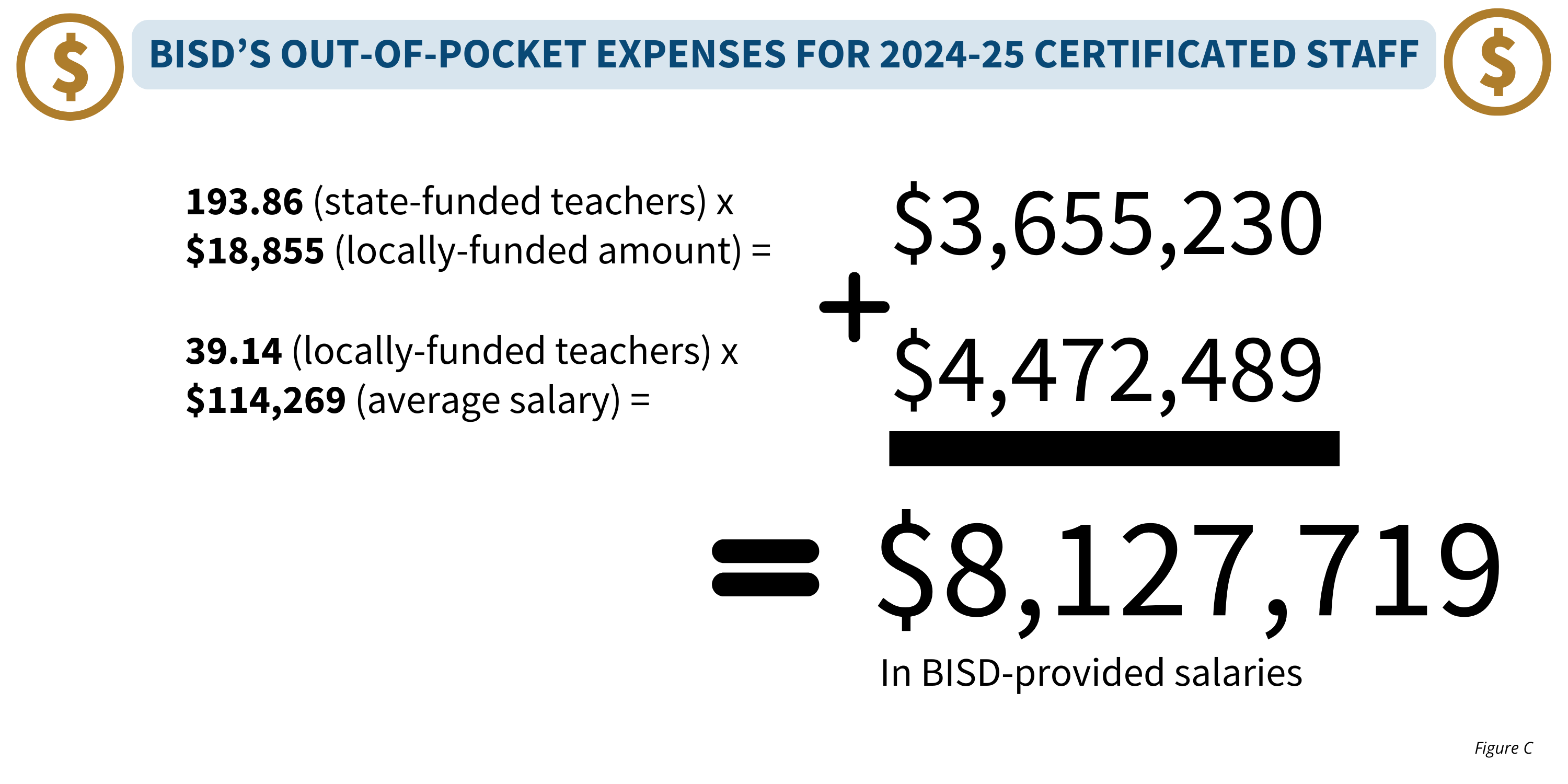 - State-provided salaries for staff do not fully cover the expense. The most straightforward example of this is teacher salaries, which have two important facets to understand. First, the state uses a state salary allocation to fund teachers based on districts’ enrollment. In 2024-25, the state allocated 193.86 teachers based on BISD’s enrollment. However, to provide a level of staffing necessary for BISD’s high-quality education, BISD staffed 233 teachers. This means BISD received ZERO funding for the 39.14 teachers above our allocation (Figure A). Second, the state provides a set figure for a teacher’s salary — $95,414 in 2024-25 — but the average actual cost for a teacher at BISD is $114,269 (Figure B). For the 2024-25 school year, BISD is paying $8.13 million in salaries from local resources (such as funds received from local levies and Bainbridge Schools Foundation) (Figure C).